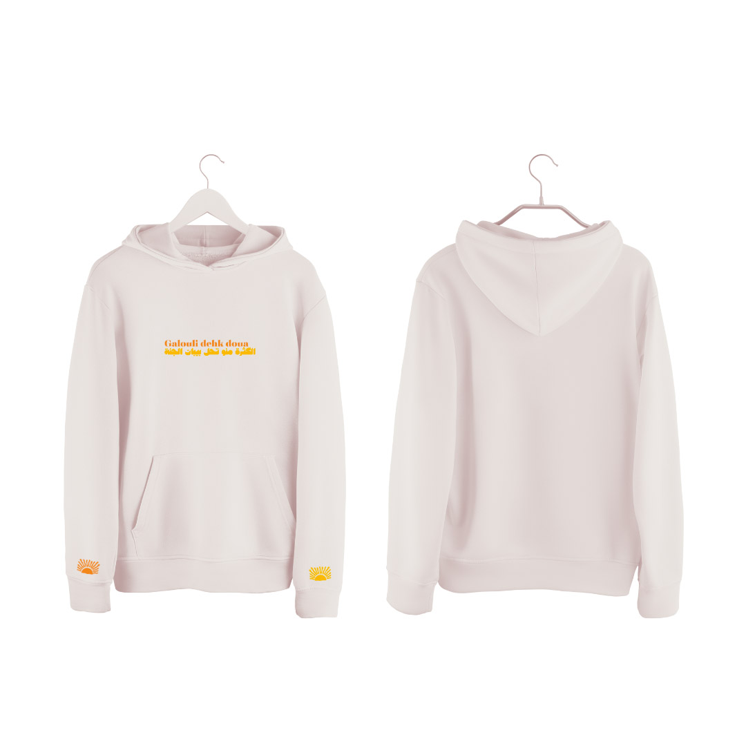 Dehk Douaya Sweathshirt holds a vibrant mantra: « they told me laughter is a remedy, an abundance of it opens the gates of paradise ». It is a soft reminder we all need, to smile, stay light, and embrace life’s challenges with positivity.